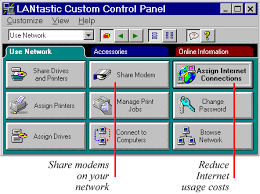 Los usuarios pueden solicitar el acceso a la red para ver cuales servidores y recursos de la red están disponibles; también pueden tener acceso al correo electrónico o bien, revisar una cola de impresión. Estas utilidades y otras más son coordinadas por el panel de control de LANtastic.